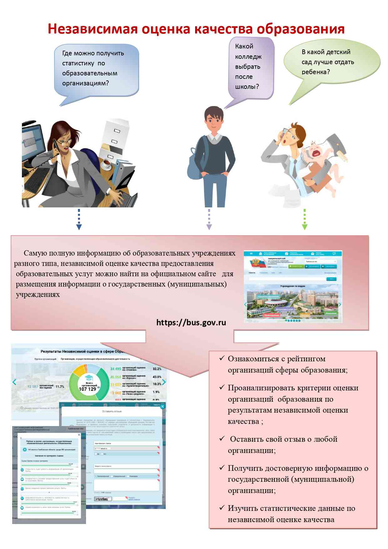 Сайт bus.gov.ru предоставляет возможность любому гражданину принять участие в онлайн-оценке деятельности образовательной организации путем заполнения формы anketa.68edu.ru. Инструкция использования сайта bus.gov.ru размещена на сайте Управления образования и науки Тамбовской области.